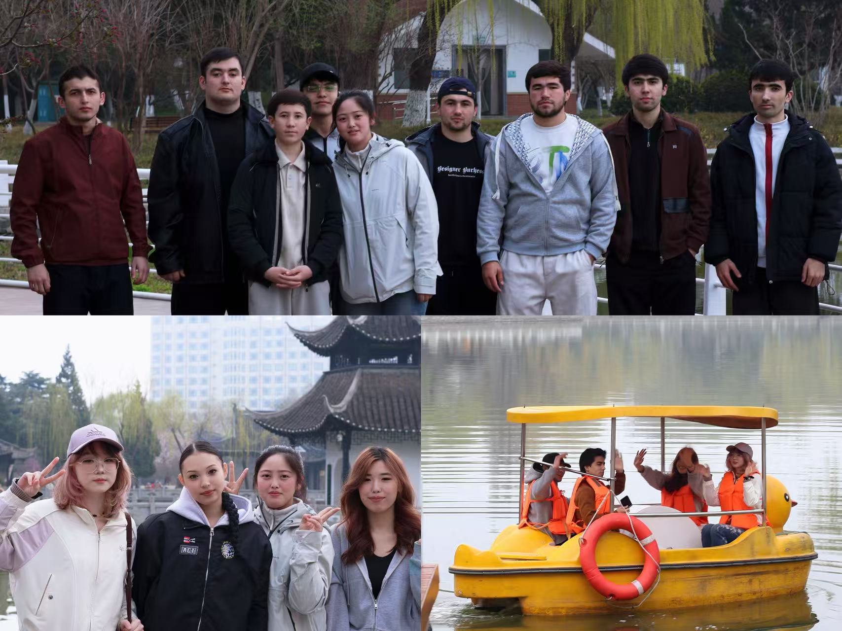 告别清晏园的古朴厚重,师生们移步至以“秀”闻名的楚秀园。园内碧水环绕,花木繁茂,处处展现着江南园林的婉约与生态之美。辅导员王思稳与班主任于雪组织留学生们泛舟湖上,亲身体验运河支流与城市生态的融合。老师们结合淮安“四水穿城”的地理特征,向同学们介绍了现代淮安如何依托运河遗产,实现历史文化保护与城市绿色发展的“双向奔赴”。