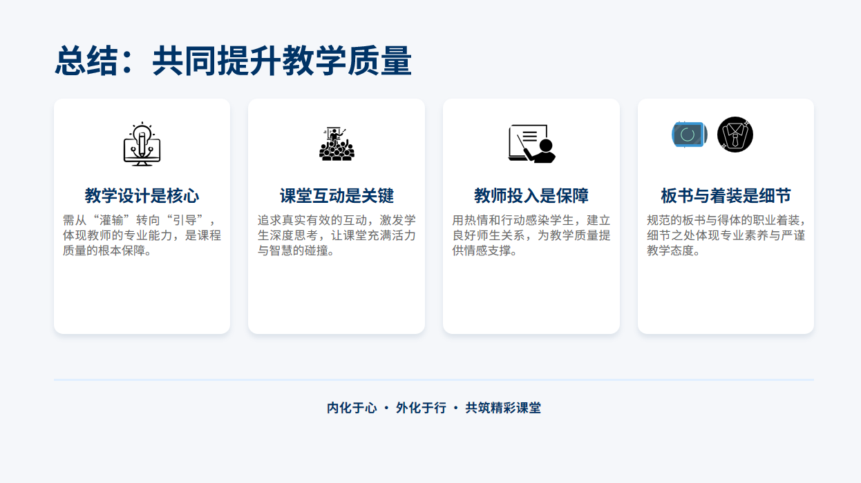 五是注重着装规范。建议教师避免过于休闲或随意的装束,以正装、得体大方的职业装为主,展现严谨、专业的教师形象。